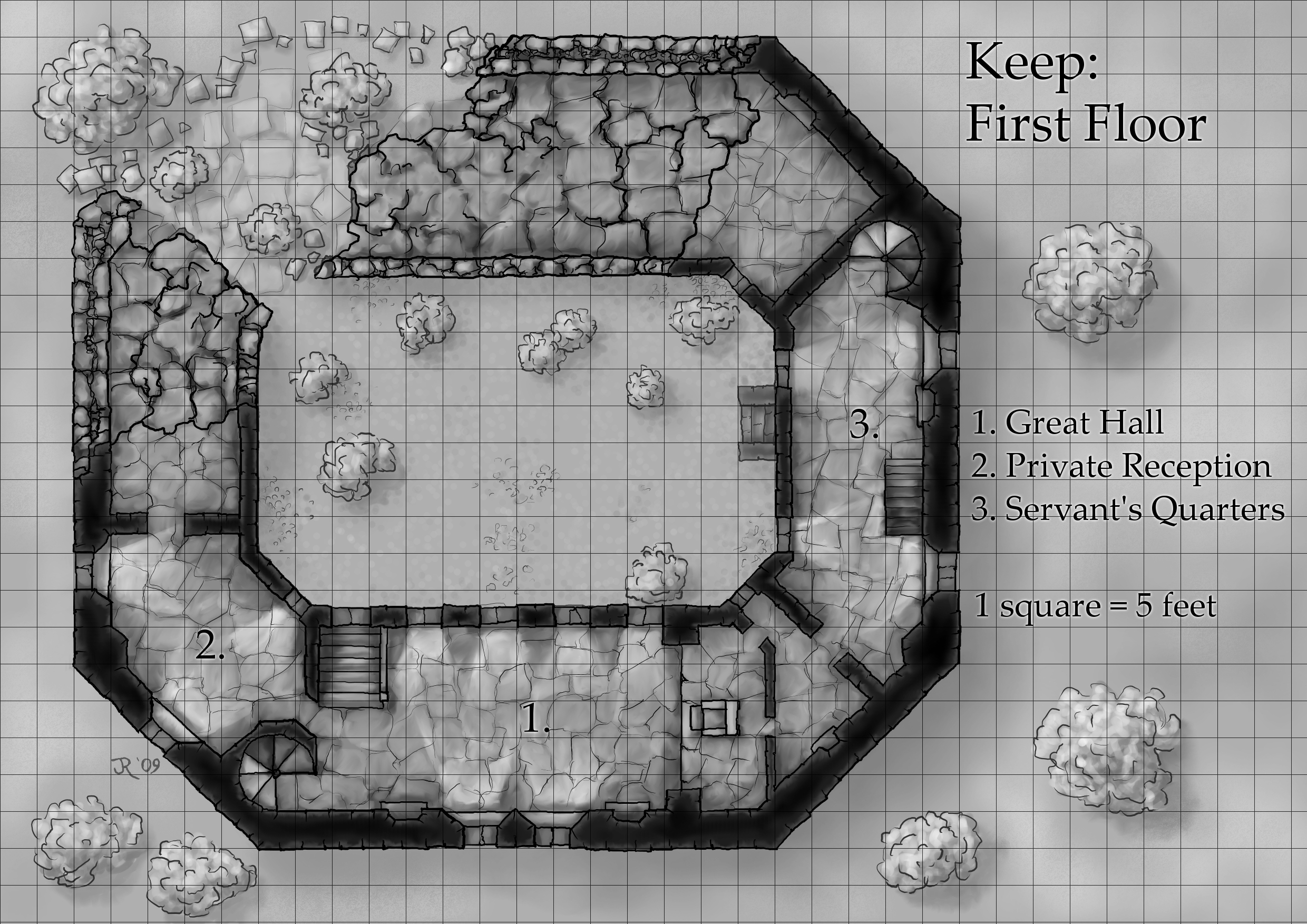 A castle map of the first floor of a ruined castle, for Mongoose Publishing’s Hyboria setting, © Mongoose Publishing, reproduced with permission